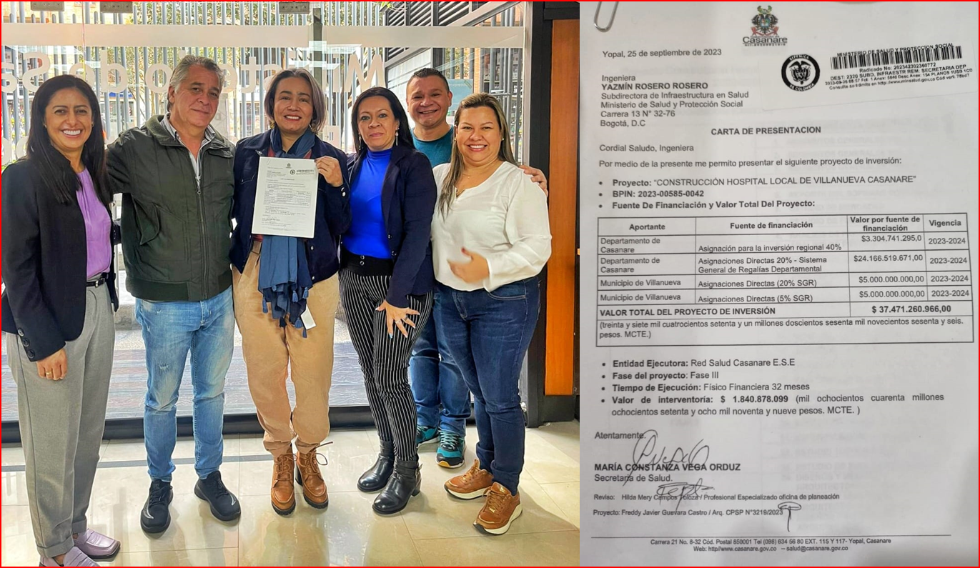 Hace menos de 12 días también fue radicado el hospital de Maní, que, junto al proyecto de Villanueva, han significado meses e inclusive años de trabajo para que la infraestructura en salud de todo un departamento se vea fortalecida. Trabajo que ha sido posible gracias al gran equipo de la Gobernación de Casanare, entre los que se encuentra: Secretarías privada, planeación, infraestructura y salud junto Red Salud Casanare ESE.